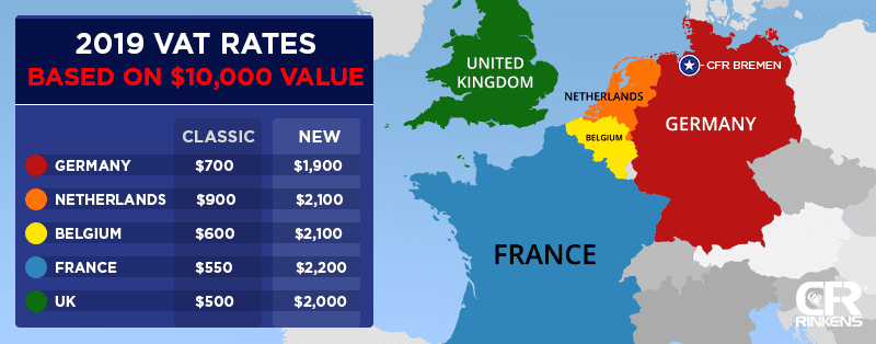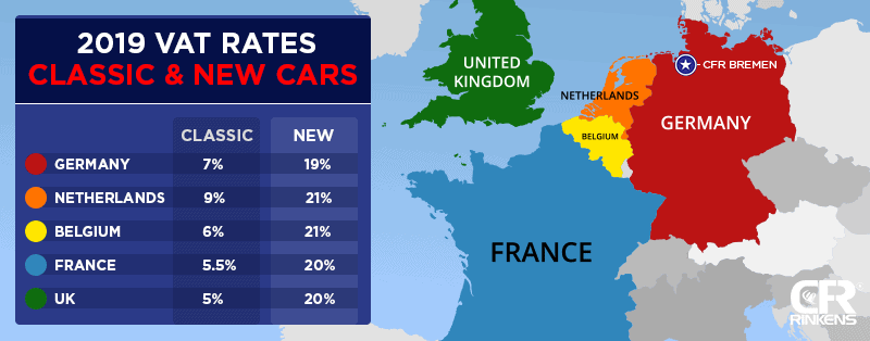 We want to help you make the best decision for importing your classic car into Europe. Here is a chart for the VAT rates for both classic and new cars for each of the typical destinations in Western Europe: