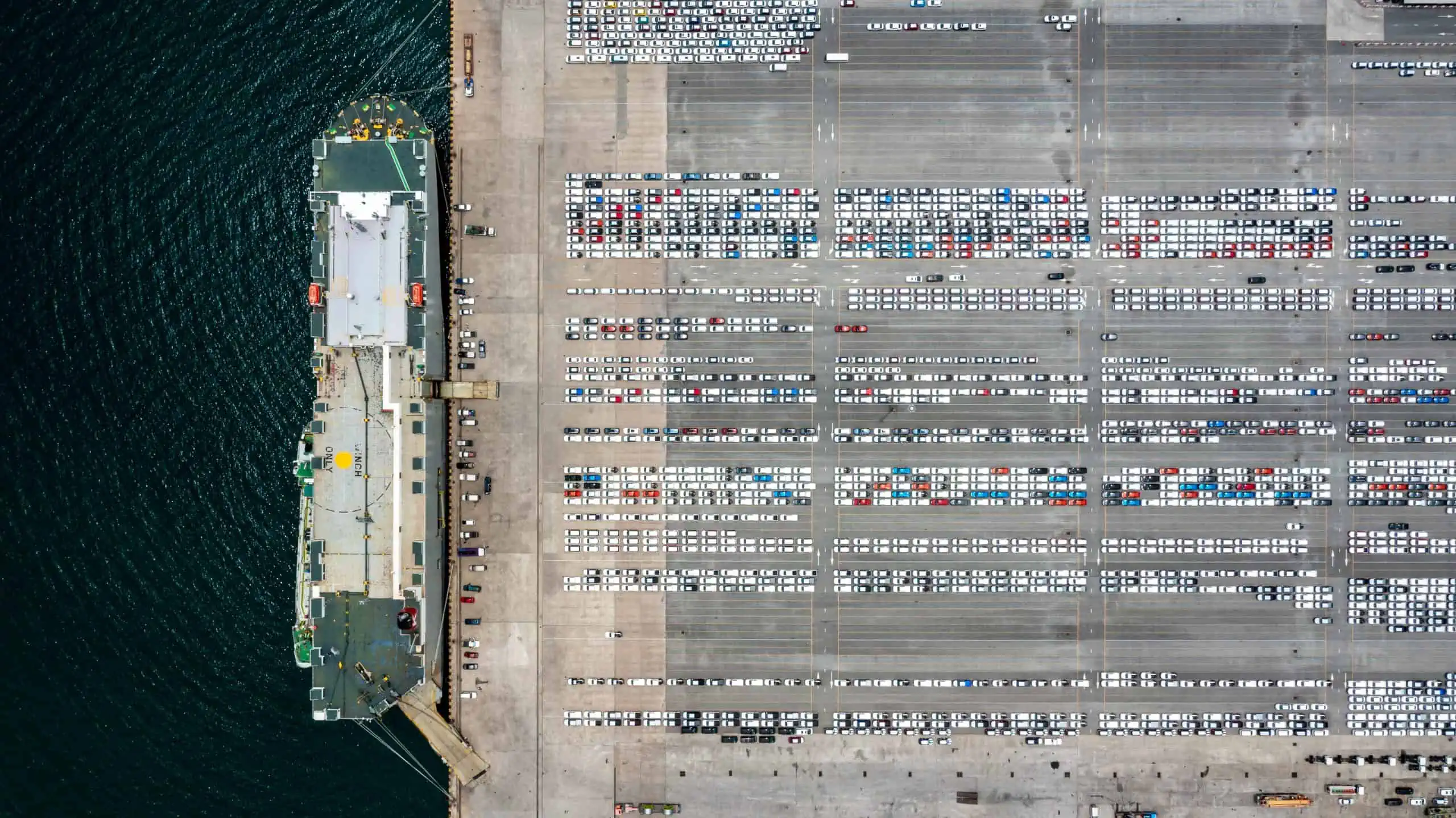 A RoRo ship next to a RoRo lot.